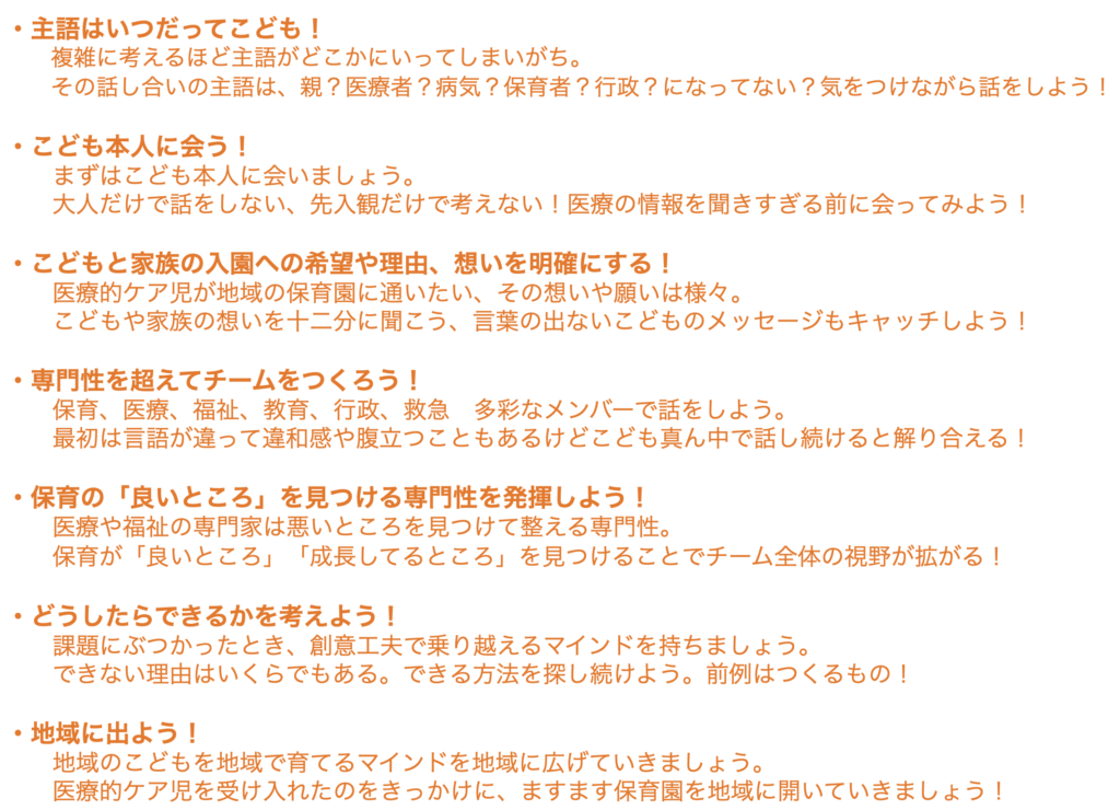 「障害や医療的ケアのある子どもたちを地域で受け入れる時の7つのポイント」として、地域の保育園や学校関係者、行政関係者の皆さまをはじめ、子どもたちに関わる全ての方々の参考になれば幸いです。